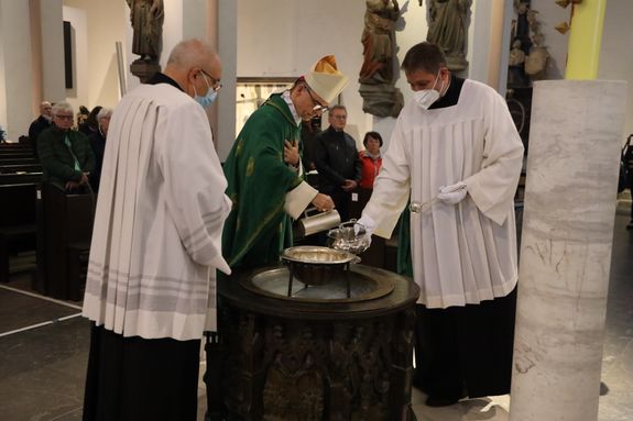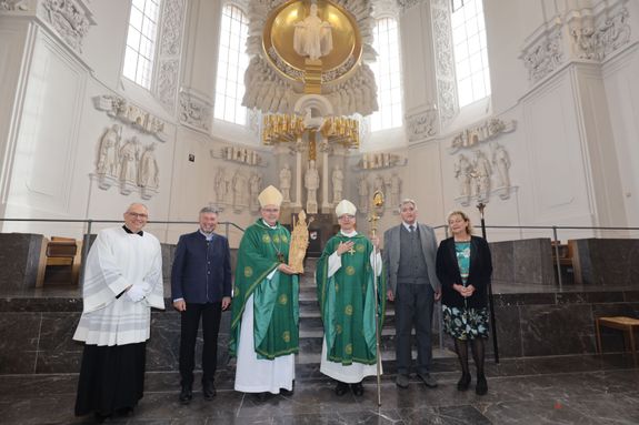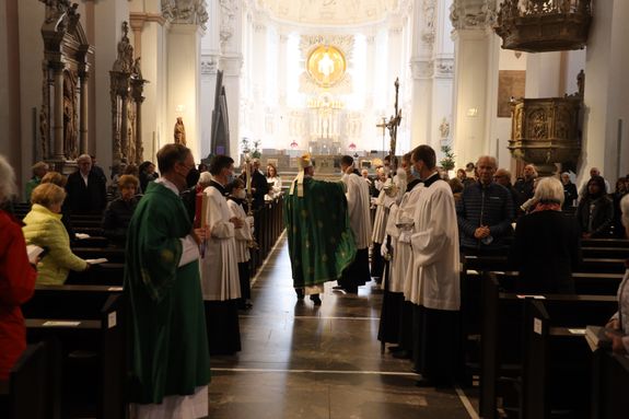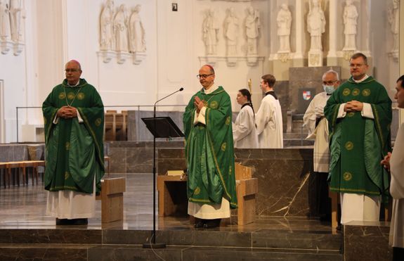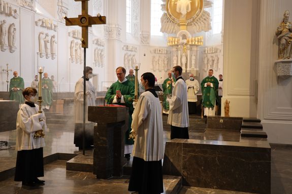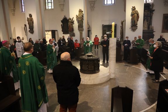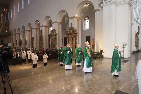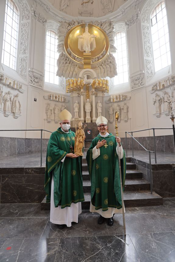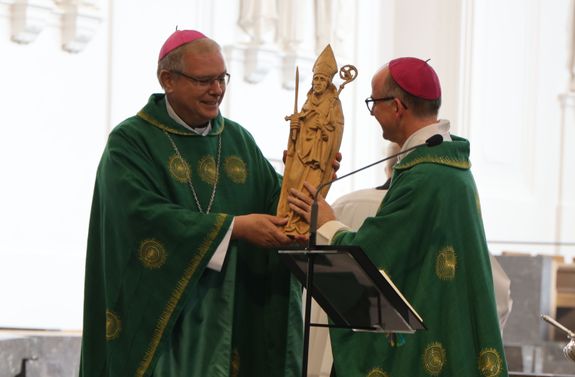 Würzburg (POW) Mit einem feierlichen Pontifikalgottesdienst im Kiliansdom hat Bischof Dr. Franz Jung am Sonntag, 17. Oktober, für das Bistum Würzburg den von Papst Franziskus initiierten Synodalen Prozess gestartet. „Das, was alle angeht, muss auch von allen und mit allen beraten werden“, so habe ein Grundsatz der jungen christlichen Kirche gelautet. So erklärte der Bischof den Hintergrund der weltweiten Bischofssynode „Für eine synodale Kirche: Gemeinschaft, Teilhabe und Sendung“. Die Predigt hielt er im Dialog mit Lucia Stamm vom Vorstand des Diözesanrats. Als Ausdruck der weltweiten Verbundenheit feierte Bischof Bernardo Johannes Bahlmann aus dem brasilianischen Partnerbistum Óbidos die Messe mit. Dieser dankte für die Unterstützung aus Unterfranken während der Coronapandemie. Bischof Jung überreichte ihm am Ende der Feier aus dem Nachlass des verstorbenen Generalvikars Dr. Karl Hillenbrand eine geschnitzte Kiliansstatue. Diese werde einen Ehrenplatz in der Kilianskapelle in der Bischofsstadt am Amazonas bekommen, versprach Bischof Bahlmann.