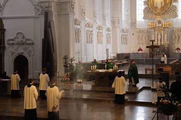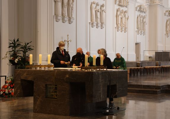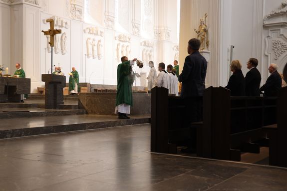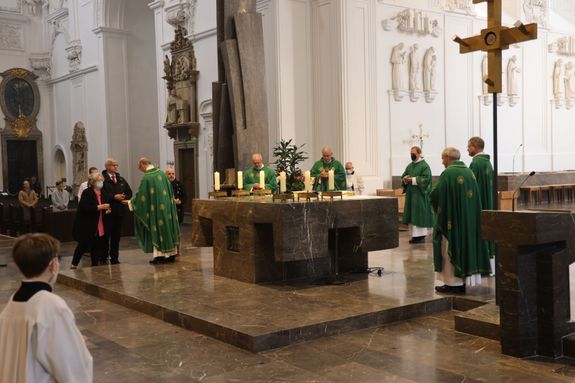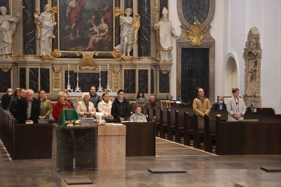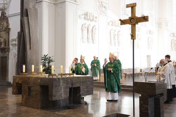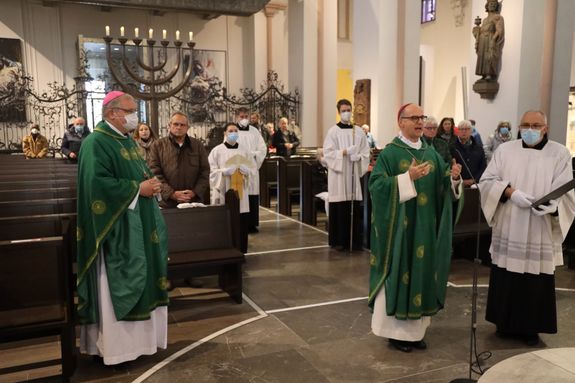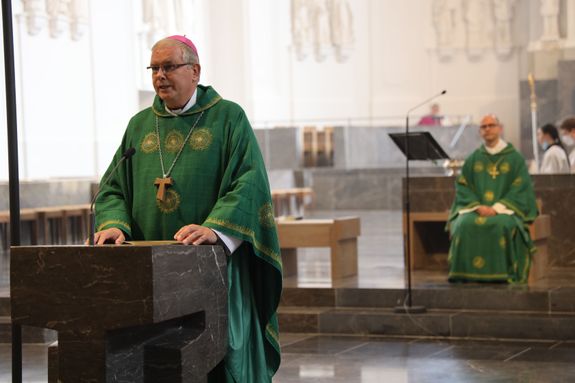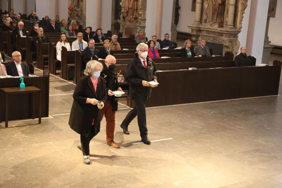 Der Gottesdienst unter den aktuellen Corona-Schutzvorschriften wurde live auf TV Mainfranken sowie im Internet übertragen. Eingeladen waren insbesondere Vertreter der Laiengremien. Der Vorstand des Diözesanrats trug bei einer kleinen Prozession die Gaben zum Altar. In der Dialogpredigt blickten Bischof Jung und Stamm gemeinsam auf das Tagesevangelium. Darin wollen sich die Apostel Jakobus und Johannes hinter dem Rücken der anderen die Plätze links und rechts von Jesus sichern. „Wie so oft im Leben lernt man an einem schlechten Beispiel besser als an einem guten“, sagte Stamm. Bischof Jung hob hervor, dass es nicht mit dem Geist der Synodalität vereinbar sei, hinter dem Rücken anderer vorzugehen. Das Wort Synode komme vom griechischen Wort für „gemeinsam auf dem Weg sein“. Deswegen sei es entscheidend, einander zuzuhören. Stamm erläuterte, dass es letztlich immer um Macht gehe. „Die entscheidende Frage lautet, wie man Macht so gestalten kann, dass sie nicht zur Unterdrückung wird, sondern hilft, sich gut zu entwickeln.“